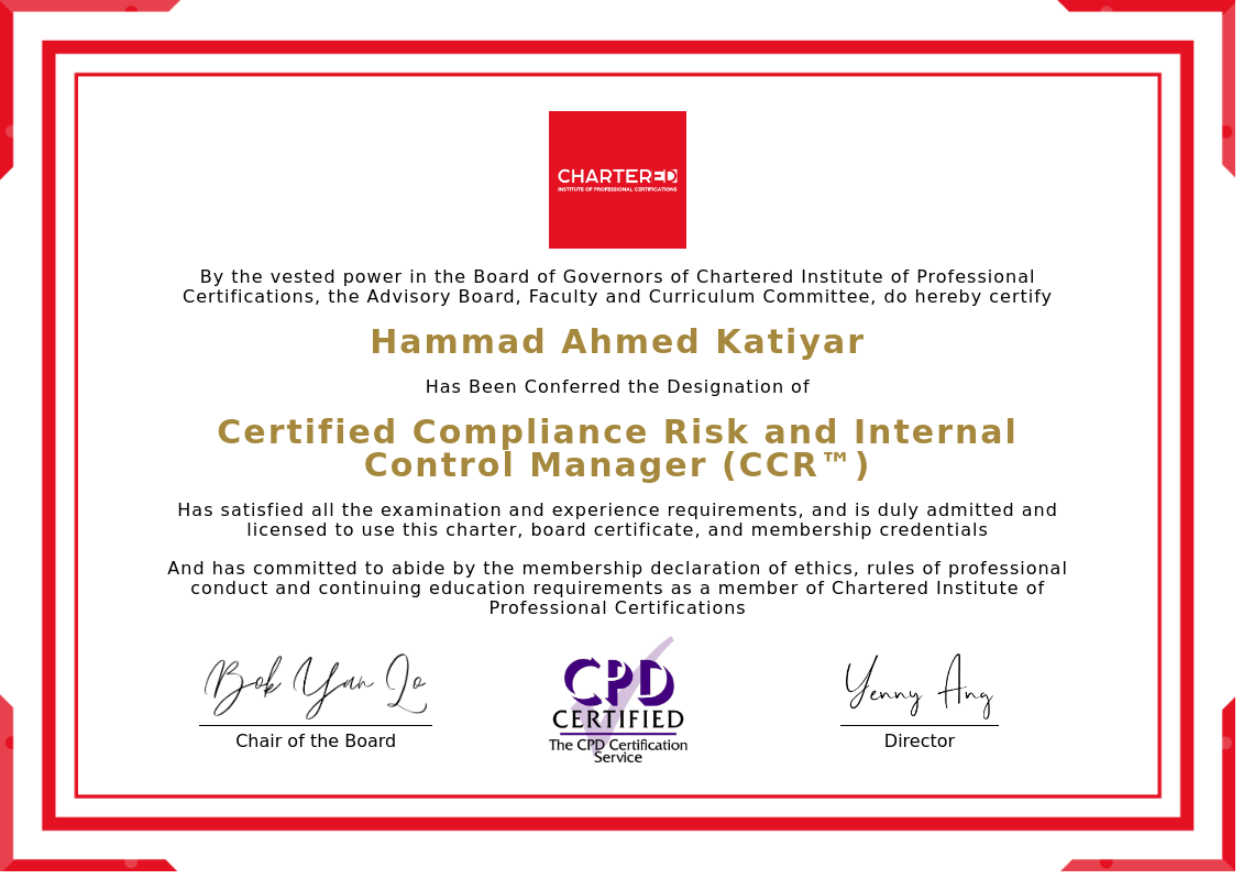The certificate above verifies that Hammad Ahmed Katiyar successfully satisfied all the exam and experience requirements and is duly admitted and licensed to use this Charter Certified Compliance Risk and Internal Control Manager (CCR™), board certificate.