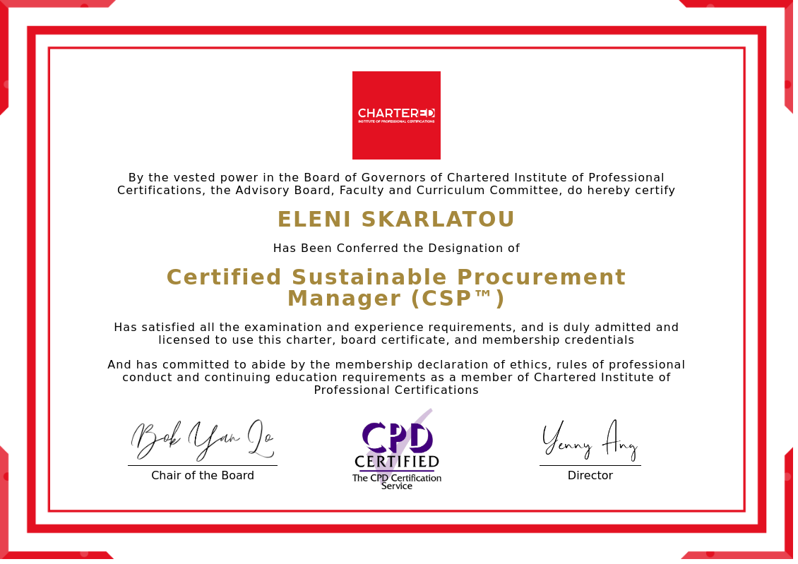 The certificate above verifies that ELENI SKARLATOU successfully satisfied all the exam and experience requirements and is duly admitted and licensed to use this Charter Certified Sustainable Procurement Manager (CSP™), board certificate.