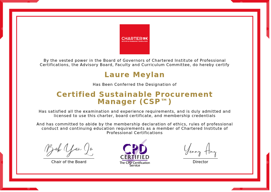 The certificate above verifies that Laure Meylan successfully satisfied all the exam and experience requirements and is duly admitted and licensed to use this Charter Certified Sustainable Procurement Manager (CSP™), board certificate.