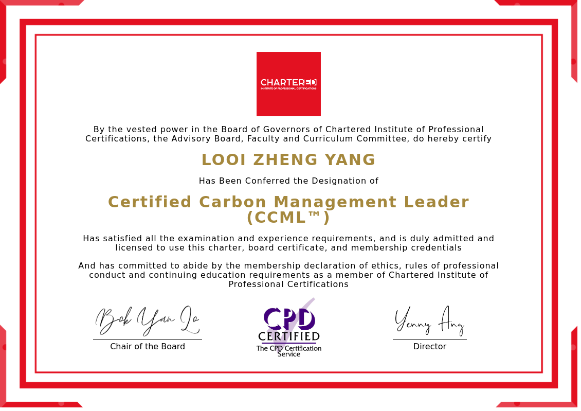 The certificate above verifies that LOOI ZHENG YANG successfully satisfied all the exam and experience requirements and is duly admitted and licensed to use this Charter Certified Carbon Management Leader (CCML™), board certificate.