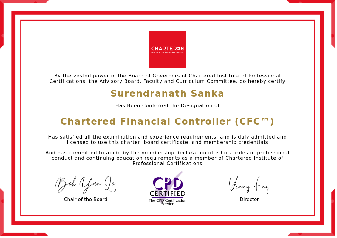 The certificate above verifies that Surendranath Sanka successfully satisfied all the exam and experience requirements and is duly admitted and licensed to use this Charter Chartered Financial Controller (CFC™), board certificate.