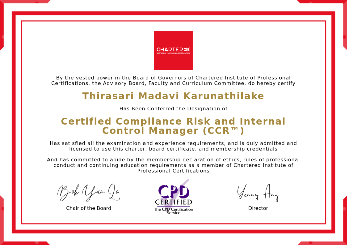 The certificate above verifies that Thirasari Madavi Karunathilake successfully satisfied all the exam and experience requirements and is duly admitted and licensed to use this Charter Certified Compliance Risk and Internal Control Manager (CCR™), board certificate.