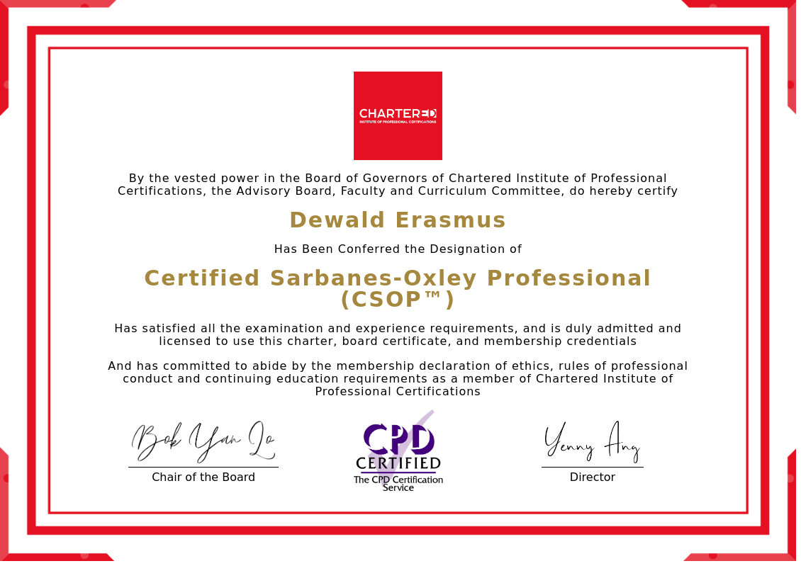 The certificate above verifies that Dewald Erasmus successfully satisfied all the exam and experience requirements and is duly admitted and licensed to use this Charter Certified Sarbanes-Oxley Professional (CSOP™), board certificate.