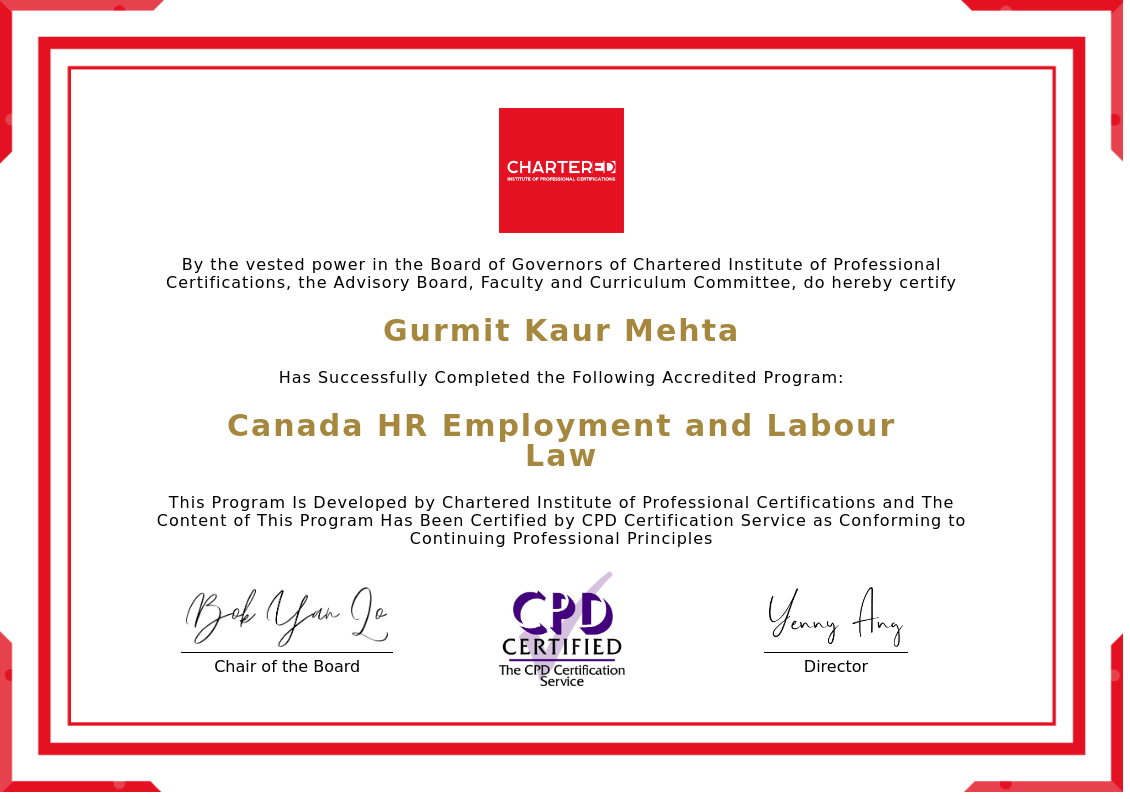 The certificate above verifies that Gurmit Kaur Mehta successfully completed the accredited program: Canada HR Employment and Labour Law.