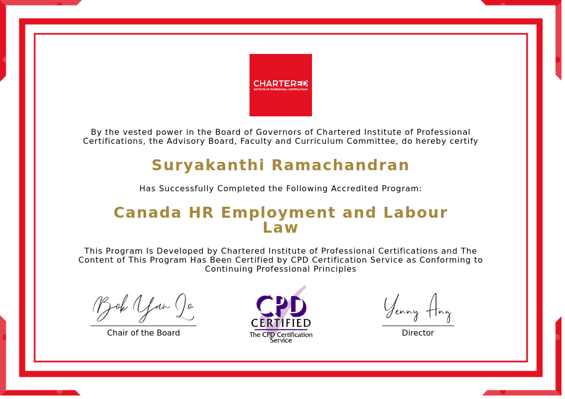 The certificate above verifies that Suryakanthi Ramachandran successfully completed the accredited program: Canada HR Employment and Labour Law.