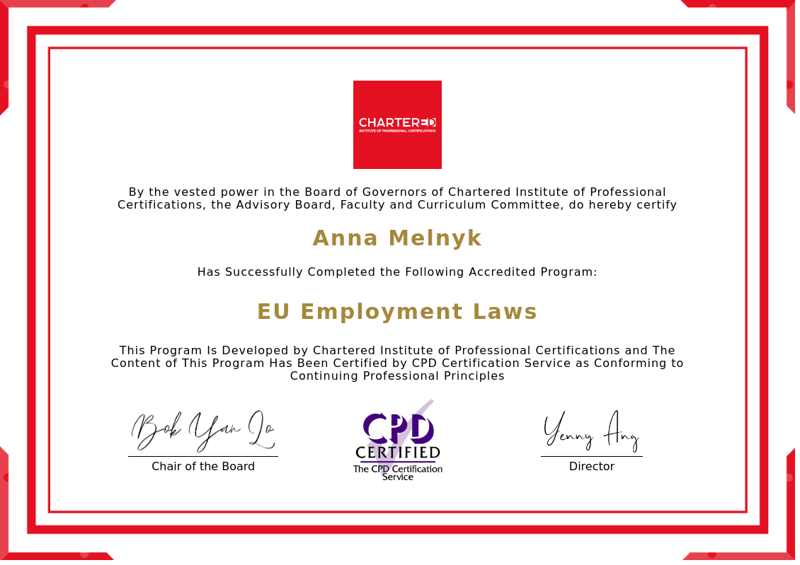 The certificate above verifies that Anna Melnyk successfully completed the accredited program: EU Labour Laws, Employment Legislations and Directives.