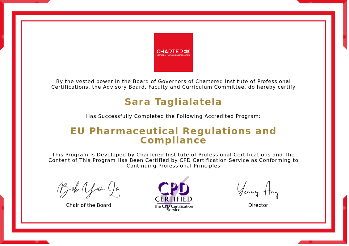 The certificate above verifies that Sara Taglialatela successfully completed the accredited program: EU Pharmaceutical Regulations and Compliance.