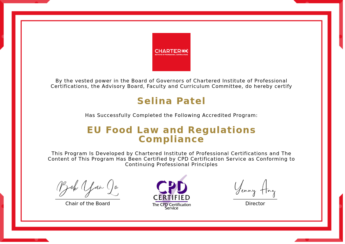 The certificate above verifies that Selina Patel successfully completed the accredited program: EU Food Law and Regulations on Food Safety, Composition, Labelling and Health Claims.