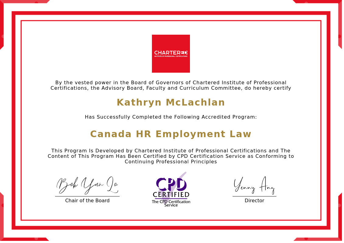 The certificate above verifies that Kathryn McLachlan successfully completed the accredited program: Canada Law on Employment Termination, Dismissal and Layoff.