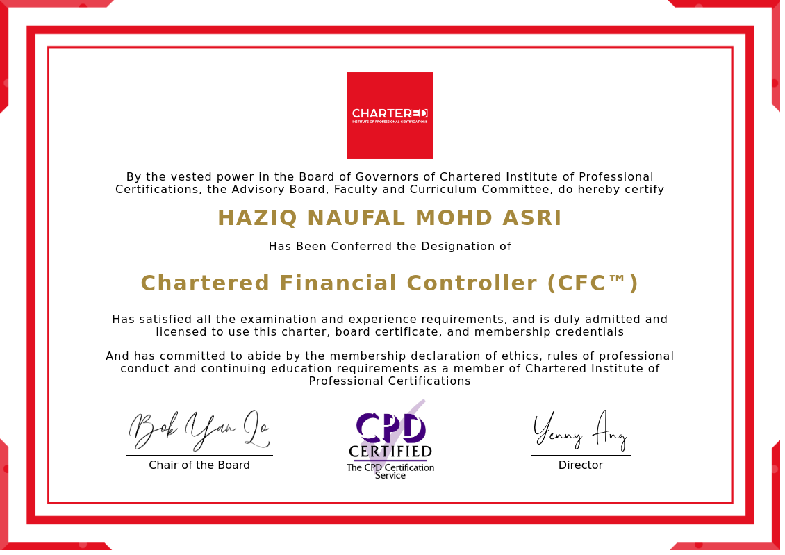 The certificate above verifies that HAZIQ NAUFAL MOHD ASRI successfully satisfied all the exam and experience requirements and is duly admitted and licensed to use this Charter Chartered Financial Controller (CFC™), board certificate.