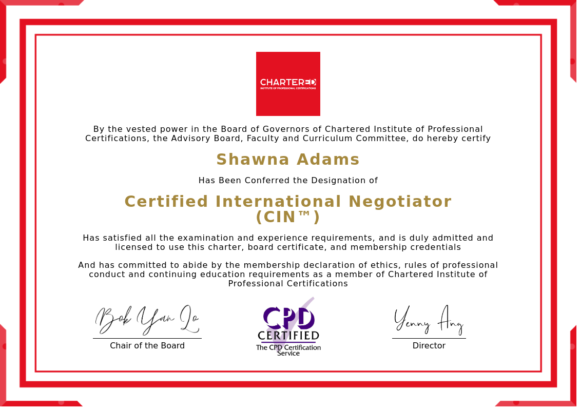 The certificate above verifies that Shawna Adams successfully satisfied all the exam and experience requirements and is duly admitted and licensed to use this Charter Certified International Negotiator (CIN™), board certificate.