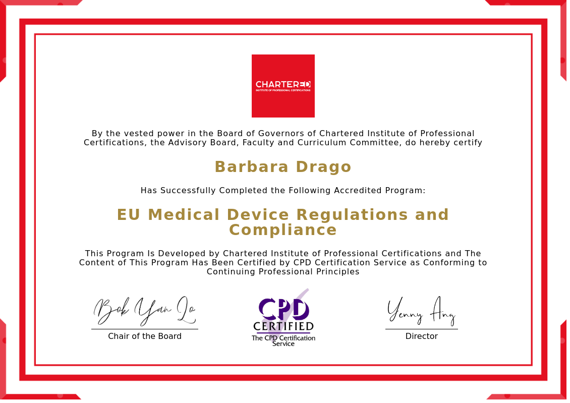 The certificate above verifies that Barbara Drago successfully completed the accredited program: EU Medical Device Regulations and Compliance.