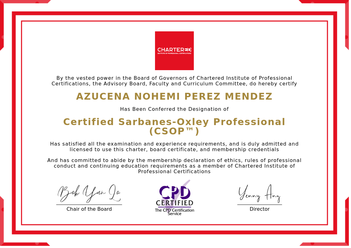 The certificate above verifies that AZUCENA NOHEMI PEREZ MENDEZ successfully satisfied all the exam and experience requirements and is duly admitted and licensed to use this Charter Certified Sarbanes-Oxley Professional (CSOP™), board certificate.