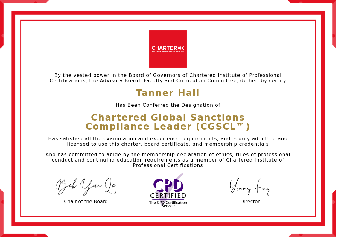 The certificate above verifies that Tanner Hall successfully satisfied all the exam and experience requirements and is duly admitted and licensed to use this Charter Chartered Global Sanctions Compliance Leader (CGSCL™), board certificate.