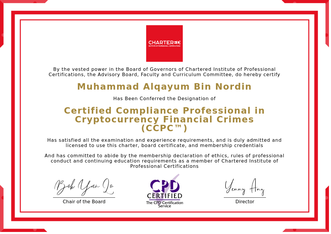 The certificate above verifies that Muhammad Alqayum Bin Nordin successfully satisfied all the exam and experience requirements and is duly admitted and licensed to use this Charter Certified Compliance Professional in Cryptocurrency Financial Crimes (CCPC™), board certificate.