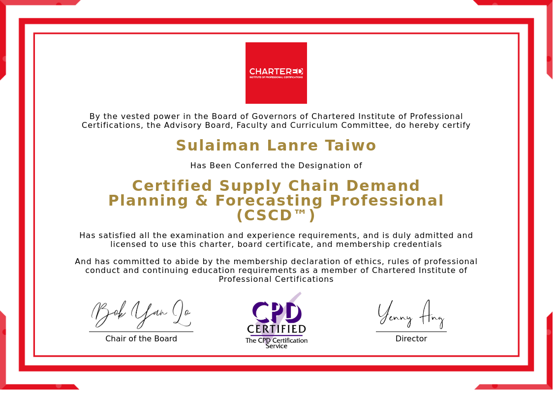 The certificate above verifies that Sulaiman Lanre Taiwo successfully satisfied all the exam and experience requirements and is duly admitted and licensed to use this Charter Certified Supply Chain Demand Planning & Forecasting Professional (CSCD™), board certificate.