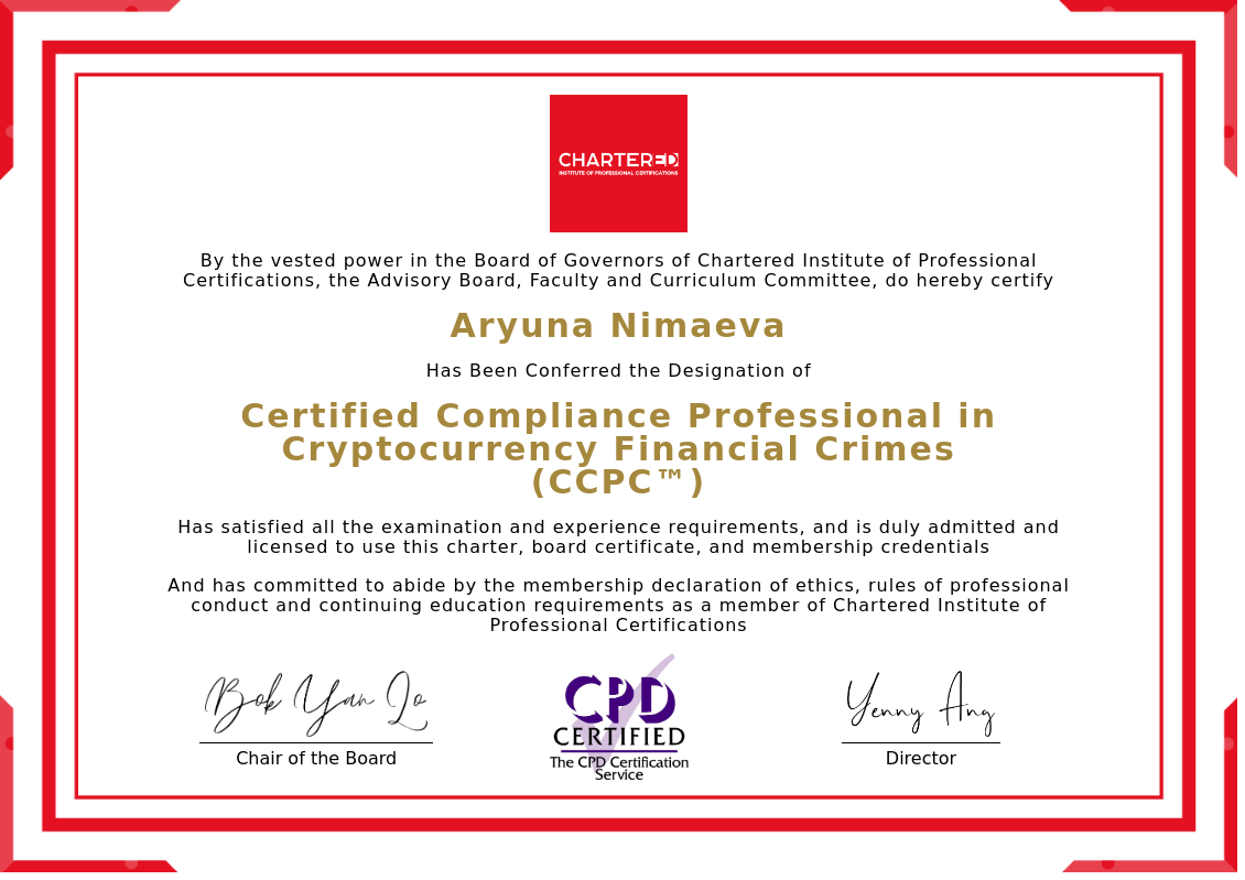 The certificate above verifies that Aryuna Nimaeva successfully satisfied all the exam and experience requirements and is duly admitted and licensed to use this Charter Certified Compliance Professional in Cryptocurrency Financial Crimes (CCPC™), board certificate.