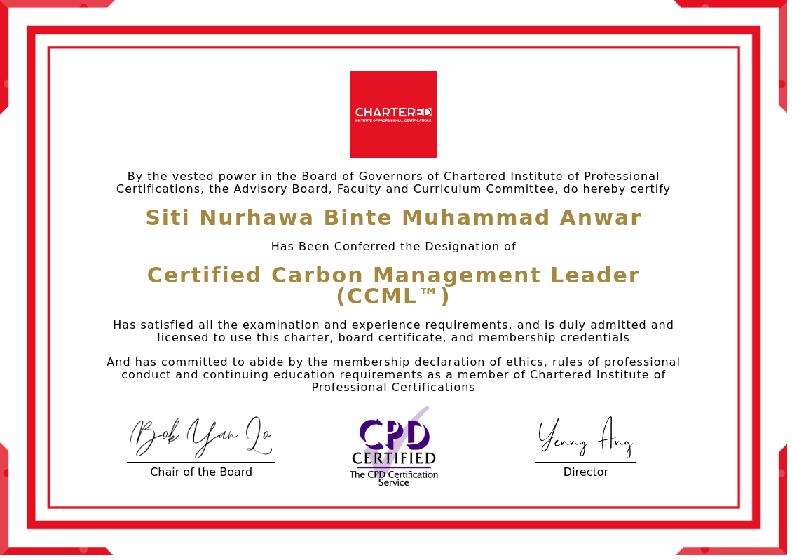 The certificate above verifies that Siti Nurhawa Binte Muhammad Anwar successfully satisfied all the exam and experience requirements and is duly admitted and licensed to use this Charter Certified Carbon Management Leader (CCML™), board certificate.
