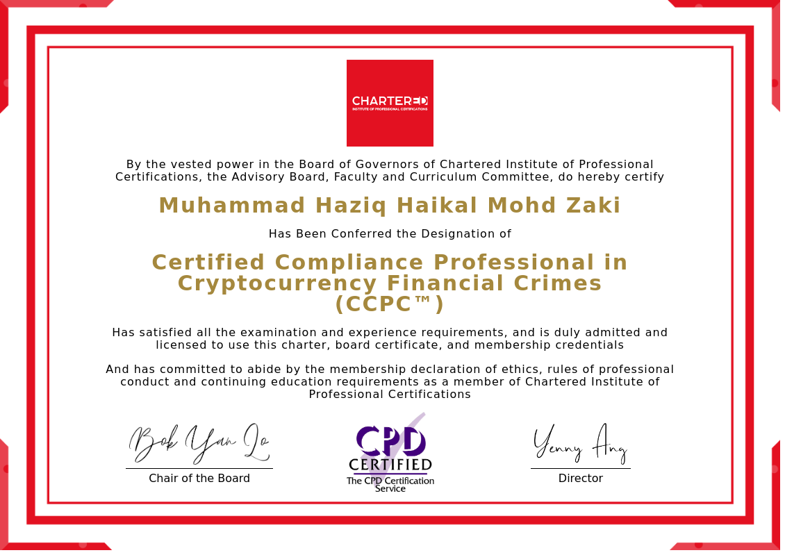 The certificate above verifies that Muhammad Haziq Haikal Mohd Zaki successfully satisfied all the exam and experience requirements and is duly admitted and licensed to use this Charter Certified Compliance Professional in Cryptocurrency Financial Crimes (CCPC™), board certificate.