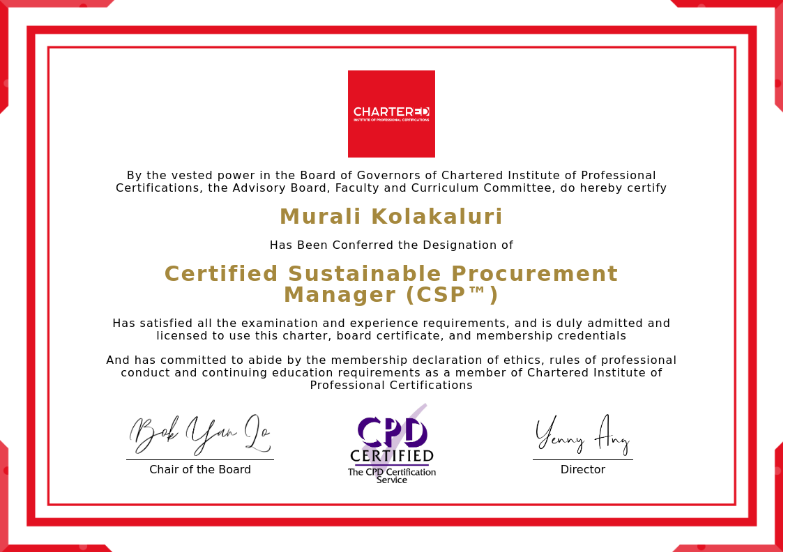 The certificate above verifies that Murali Kolakaluri successfully satisfied all the exam and experience requirements and is duly admitted and licensed to use this Charter Certified Sustainable Procurement Manager (CSP™), board certificate.