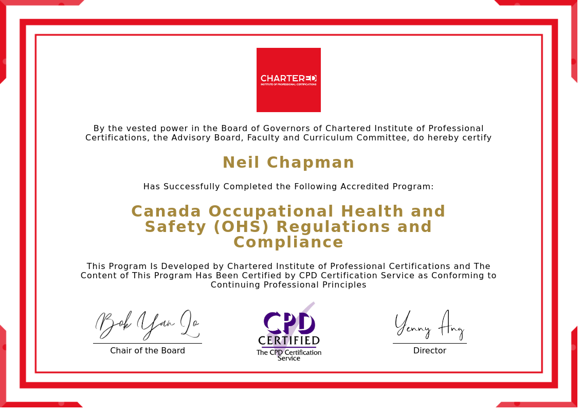 The certificate above verifies that Neil Chapman successfully completed the accredited program: Canada Occupational Health and Safety (OHS) Regulations and Compliance.