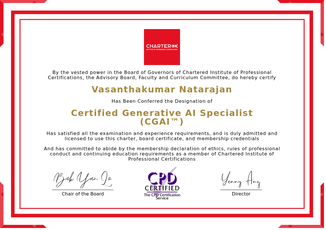 The certificate above verifies that Vasanthakumar Natarajan successfully satisfied all the exam and experience requirements and is duly admitted and licensed to use this Charter Certified Generative AI Specialist (CGAI™), board certificate.