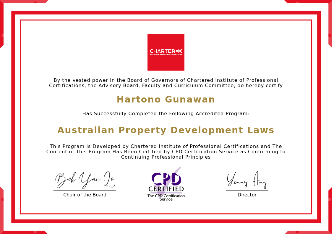 The certificate above verifies that Hartono Gunawan successfully completed the accredited program: Australia Property Development Laws, Building Regulations and Planning.