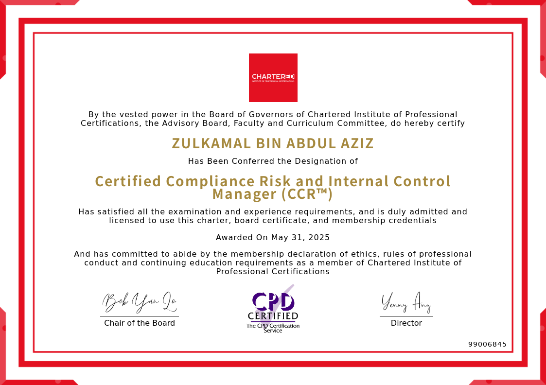 The certificate above verifies that ZULKAMAL BIN ABDUL AZIZ successfully satisfied all the exam and experience requirements and is duly admitted and licensed to use this Charter Certified Compliance Risk and Internal Control Manager (CCR™), board certificate.