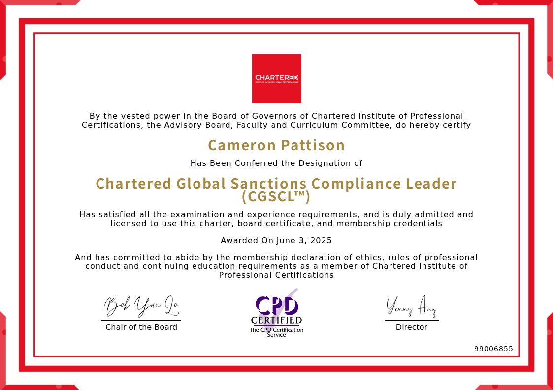 The certificate above verifies that Cameron Pattison successfully satisfied all the exam and experience requirements and is duly admitted and licensed to use this Charter Chartered Global Sanctions Compliance Leader (CGSCL™), board certificate.