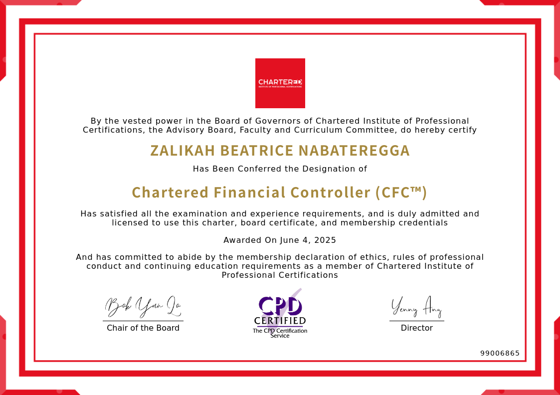 The certificate above verifies that ZALIKAH BEATRICE NABATEREGGA successfully satisfied all the exam and experience requirements and is duly admitted and licensed to use this Charter Chartered Financial Controller (CFC™), board certificate.