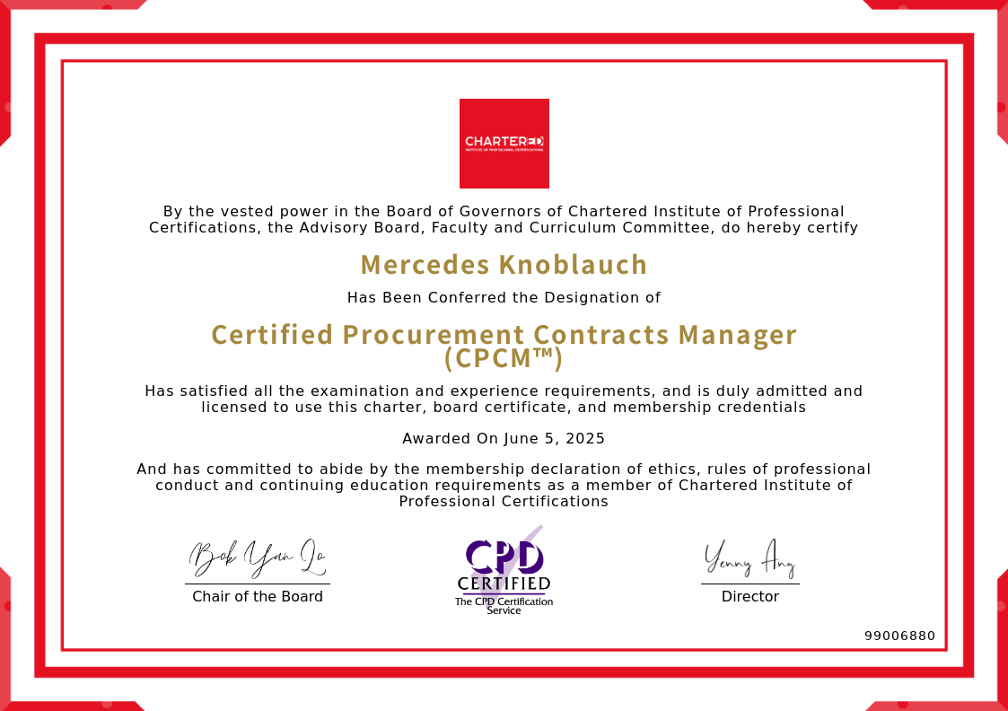 The certificate above verifies that Mercedes Knoblauch successfully satisfied all the exam and experience requirements and is duly admitted and licensed to use this Charter Certified Procurement Contracts Manager (CPCM™), board certificate.