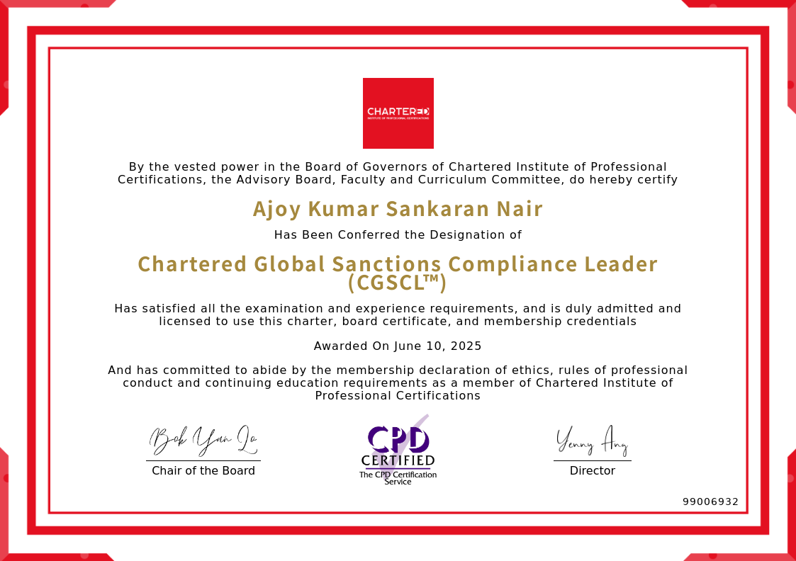 The certificate above verifies that Ajoy Kumar Sankaran Nair successfully satisfied all the exam and experience requirements and is duly admitted and licensed to use this Charter Chartered Global Sanctions Compliance Leader (CGSCL™), board certificate.