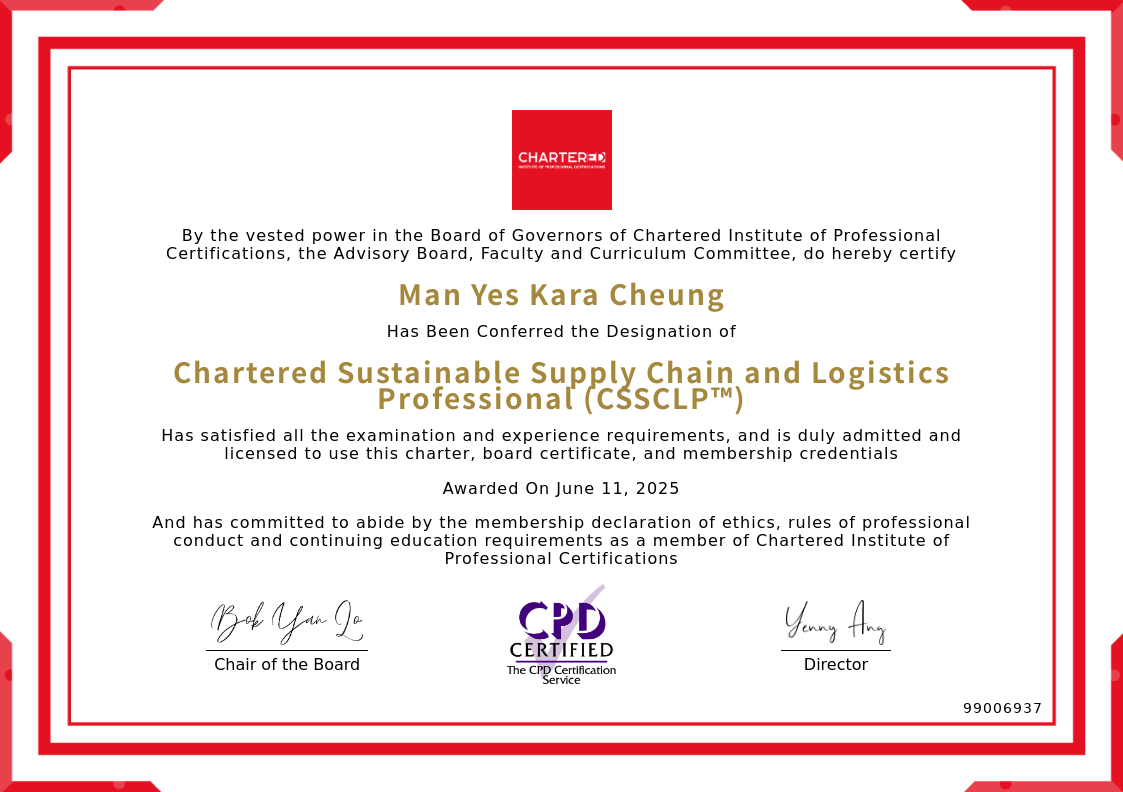 The certificate above verifies that Man Yes Kara Cheung successfully satisfied all the exam and experience requirements and is duly admitted and licensed to use this Charter Chartered Sustainable Supply Chain and Logistics Professional (CSSCLP™), board certificate.