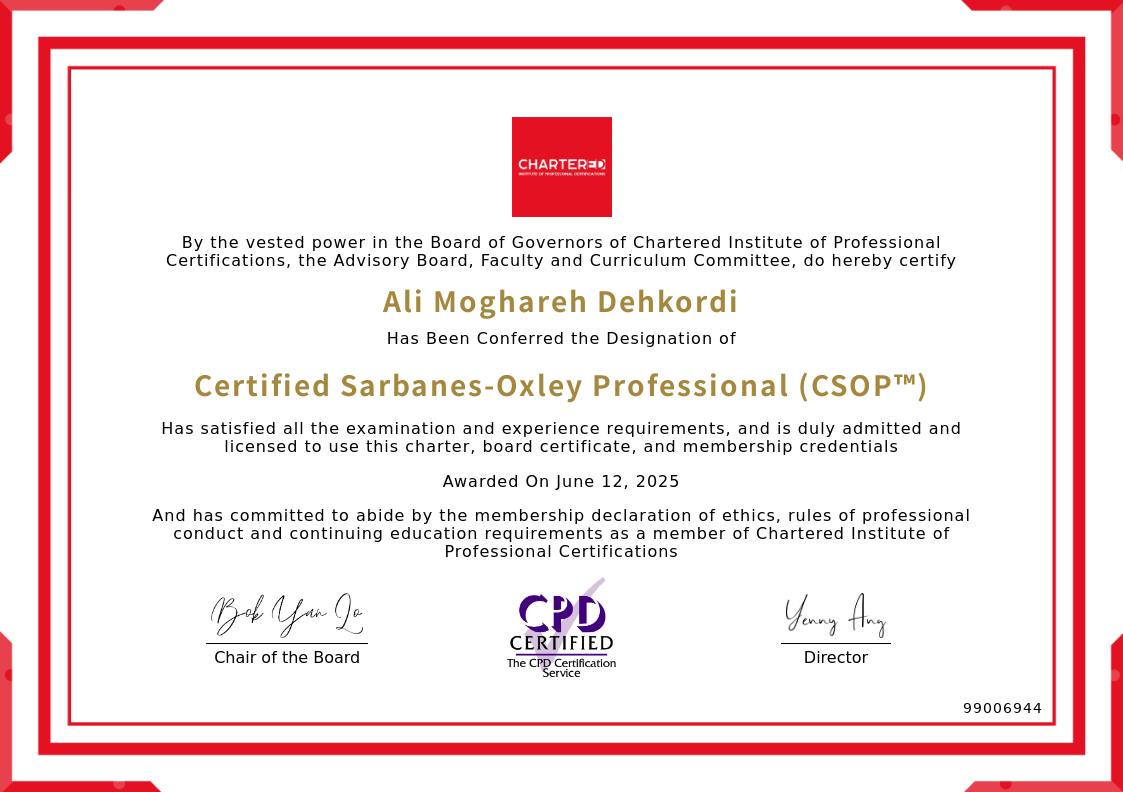 The certificate above verifies that Ali Moghareh Dehkordi successfully satisfied all the exam and experience requirements and is duly admitted and licensed to use this Charter Certified Sarbanes-Oxley Professional (CSOP™), board certificate.