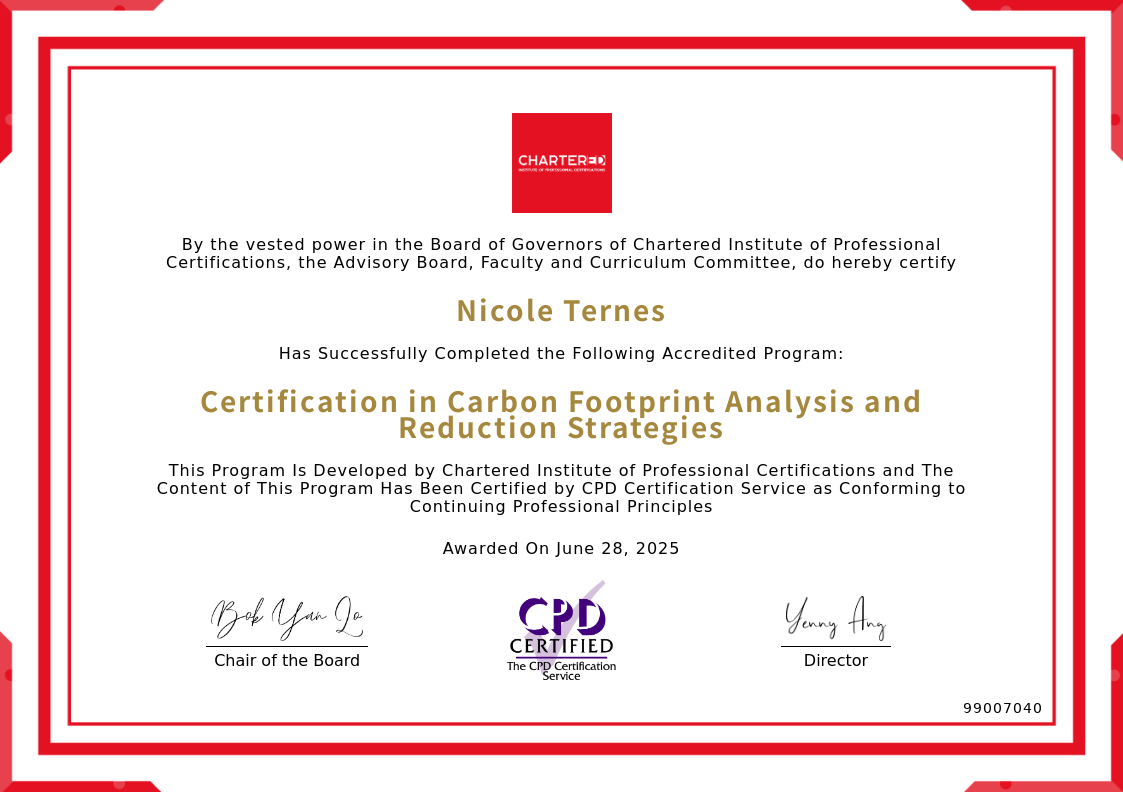 The certificate above verifies that Nicole Ternes successfully completed the accredited program: Certified Carbon Footprint Analysis and Reduction Strategies.