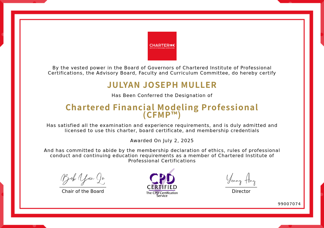 The certificate above verifies that JULYAN JOSEPH MULLER successfully satisfied all the exam and experience requirements and is duly admitted and licensed to use this Charter Chartered Financial Modeling Professional (CFMP™), board certificate.