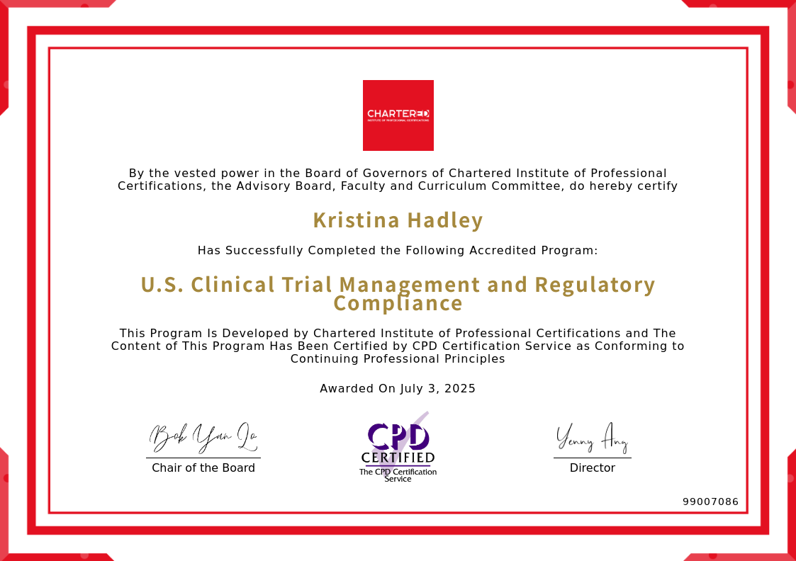 The certificate above verifies that Kristina Hadley successfully completed the accredited program: U.S. Clinical Trial Management and Regulatory Compliance.