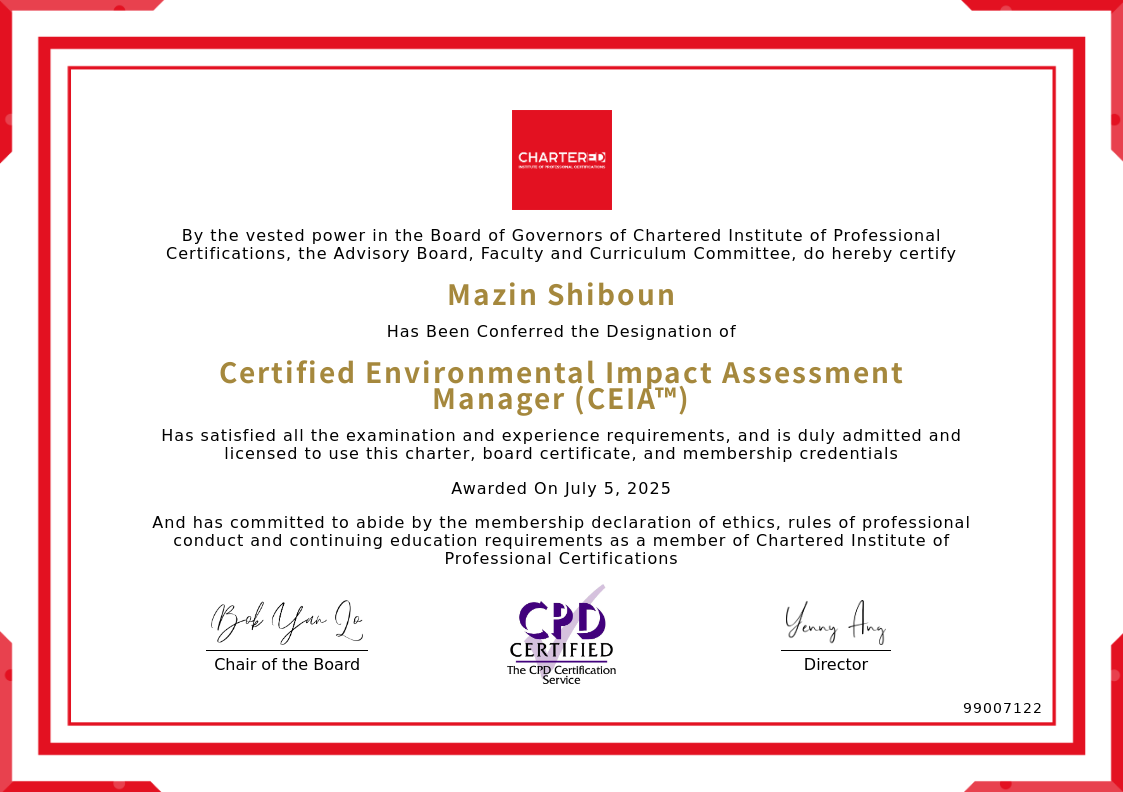 The certificate above verifies that Mazin Shiboun successfully satisfied all the exam and experience requirements and is duly admitted and licensed to use this Charter Certified Environmental Impact Assessment Manager (CEIA™), board certificate.