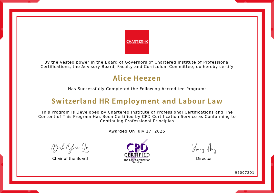 The certificate above verifies that Alice Heezen successfully completed the accredited program: Switzerland HR Employment and Labour Law.