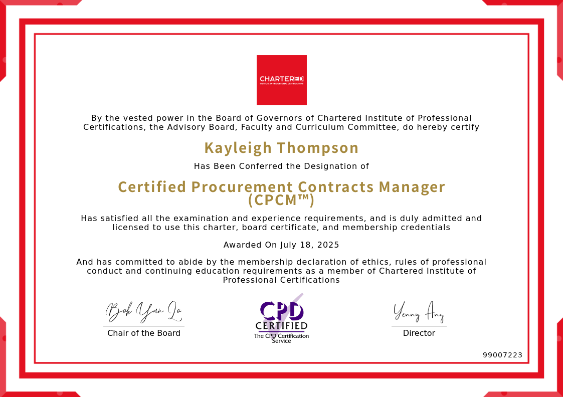 The certificate above verifies that Kayleigh Thompson successfully satisfied all the exam and experience requirements and is duly admitted and licensed to use this Charter Certified Procurement Contracts Manager (CPCM™), board certificate.