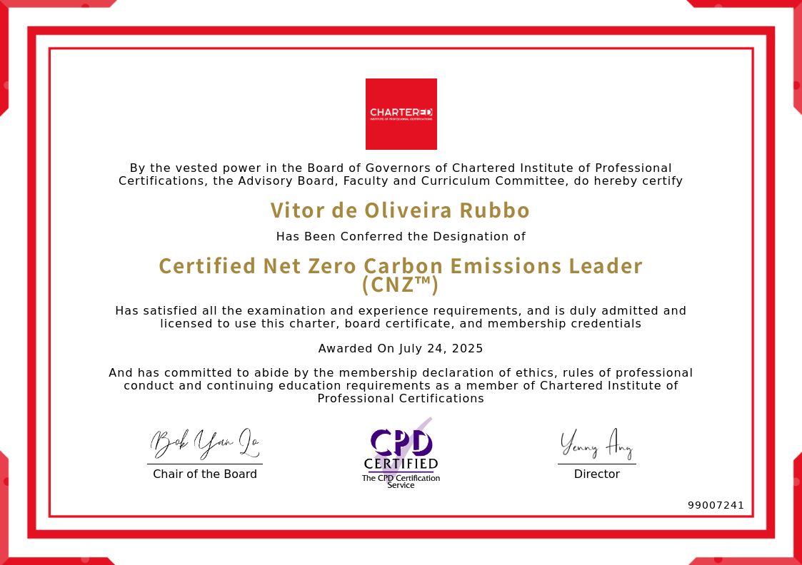 The certificate above verifies that Vitor de Oliveira Rubbo successfully satisfied all the exam and experience requirements and is duly admitted and licensed to use this Charter Certified Net Zero Carbon Emissions Leader (CNZ™), board certificate.