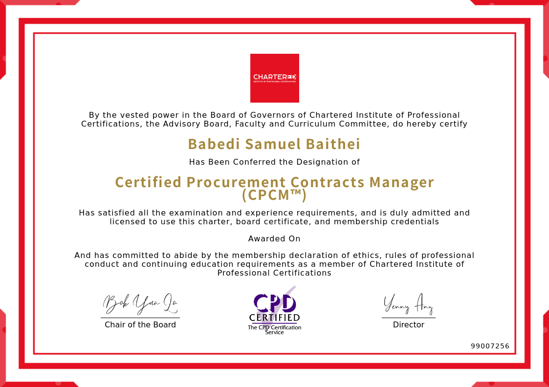 The certificate above verifies that Babedi Samuel Baithei successfully satisfied all the exam and experience requirements and is duly admitted and licensed to use this Charter Certified Procurement Contracts Manager (CPCM™), board certificate.
