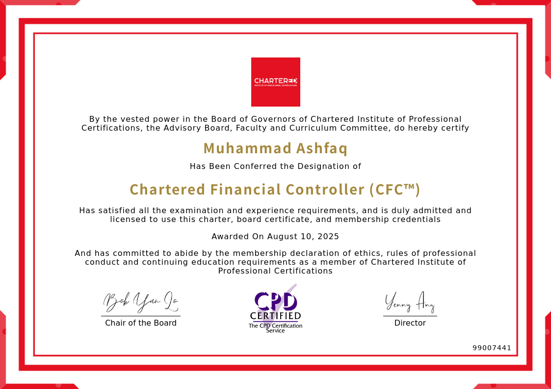 The certificate above verifies that Muhammad Ashfaq successfully satisfied all the exam and experience requirements and is duly admitted and licensed to use this Charter Chartered Financial Controller (CFC™), board certificate.