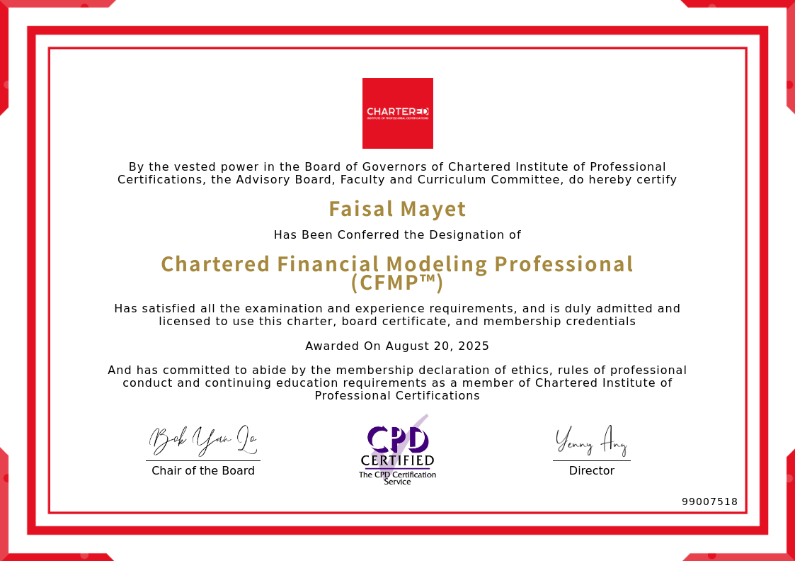 The certificate above verifies that Faisal Mayet successfully satisfied all the exam and experience requirements and is duly admitted and licensed to use this Charter Chartered Financial Modeling Professional (CFMP™), board certificate.