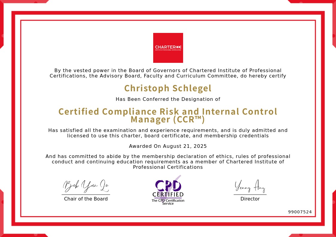 The certificate above verifies that Christoph Schlegel successfully satisfied all the exam and experience requirements and is duly admitted and licensed to use this Charter Certified Compliance Risk and Internal Control Manager (CCR™), board certificate.