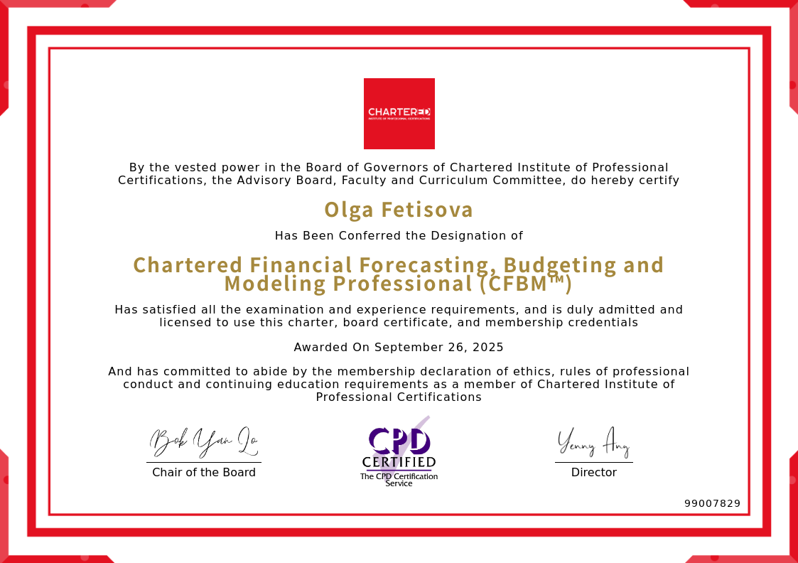 The certificate above verifies that Olga Fetisova successfully satisfied all the exam and experience requirements and is duly admitted and licensed to use this Charter Chartered Financial Forecasting, Budgeting and Modeling Professional (CFBM™), board certificate.