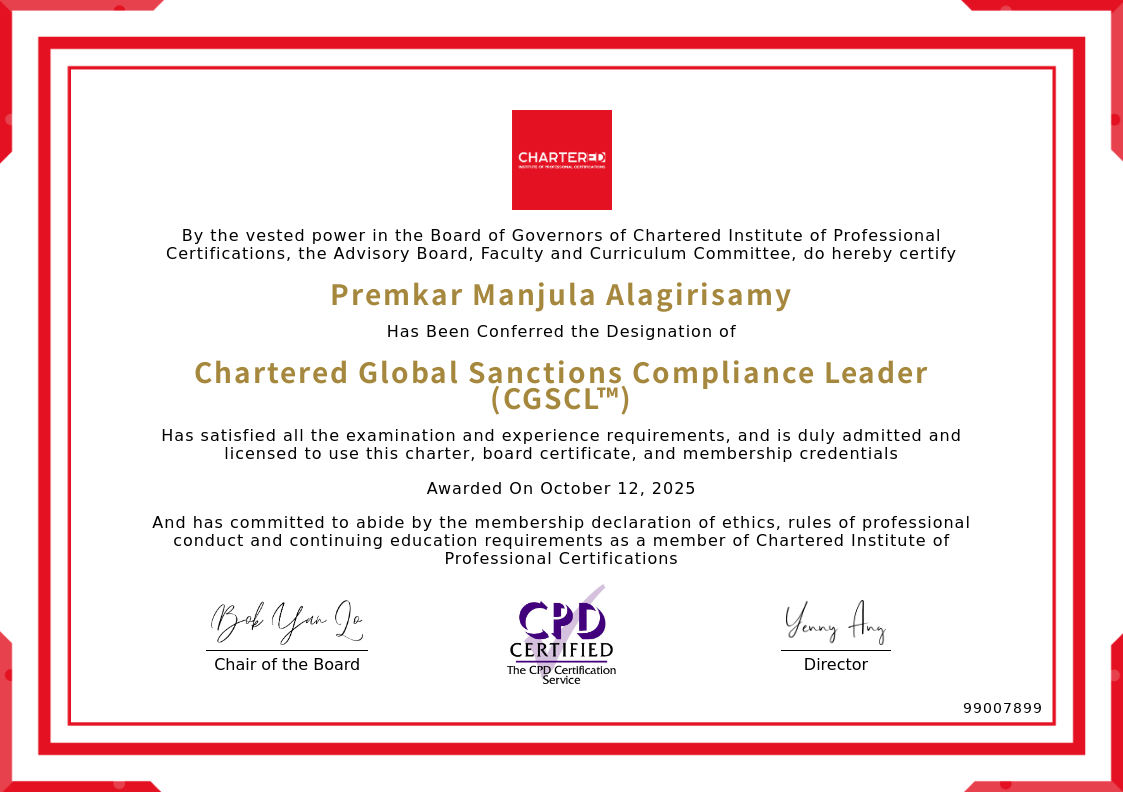 The certificate above verifies that Premkar Manjula Alagirisamy successfully satisfied all the exam and experience requirements and is duly admitted and licensed to use this Charter Chartered Global Sanctions Compliance Leader (CGSCL™), board certificate.