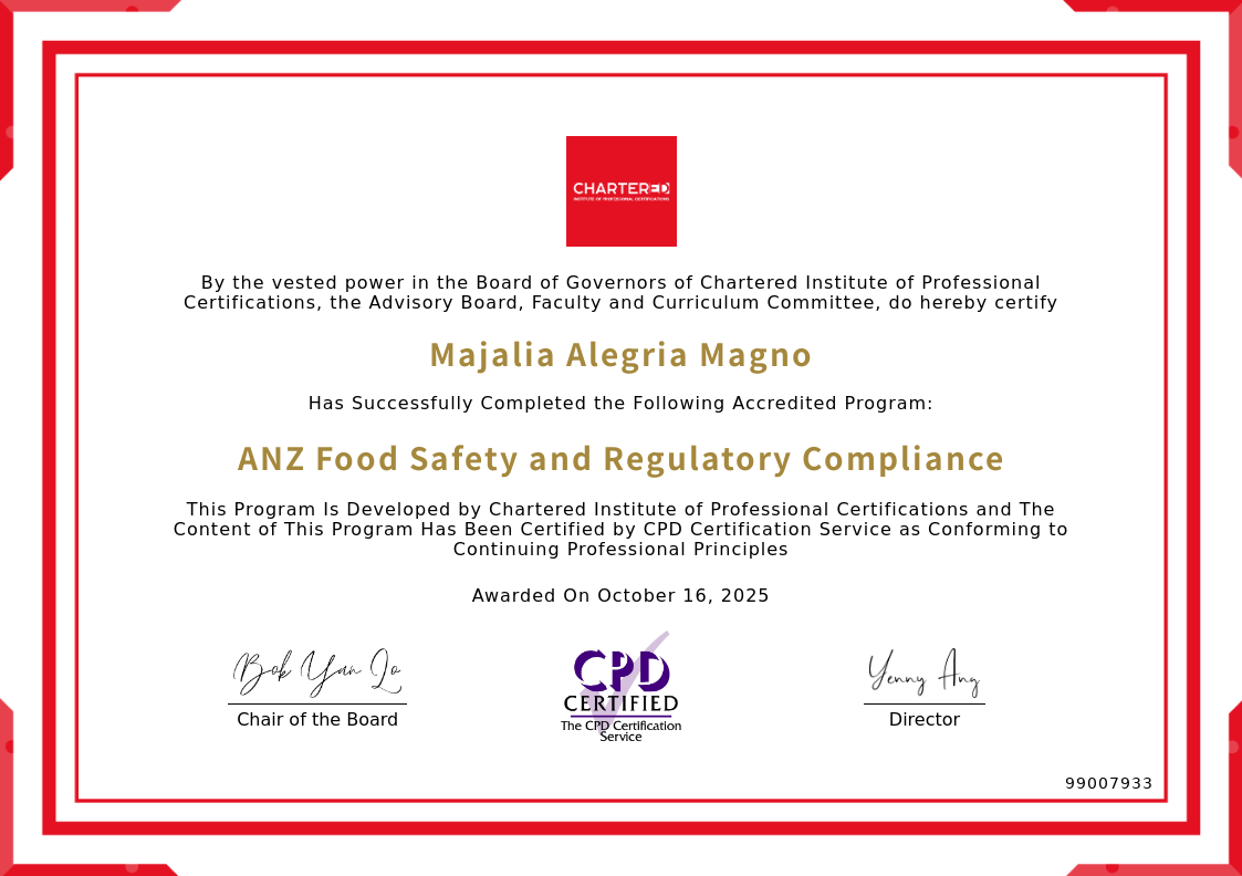 The certificate above verifies that Majalia Alegria Magno successfully completed the accredited program: Australia New Zealand Food Standards Code, Safety Regulations and Labelling Laws.