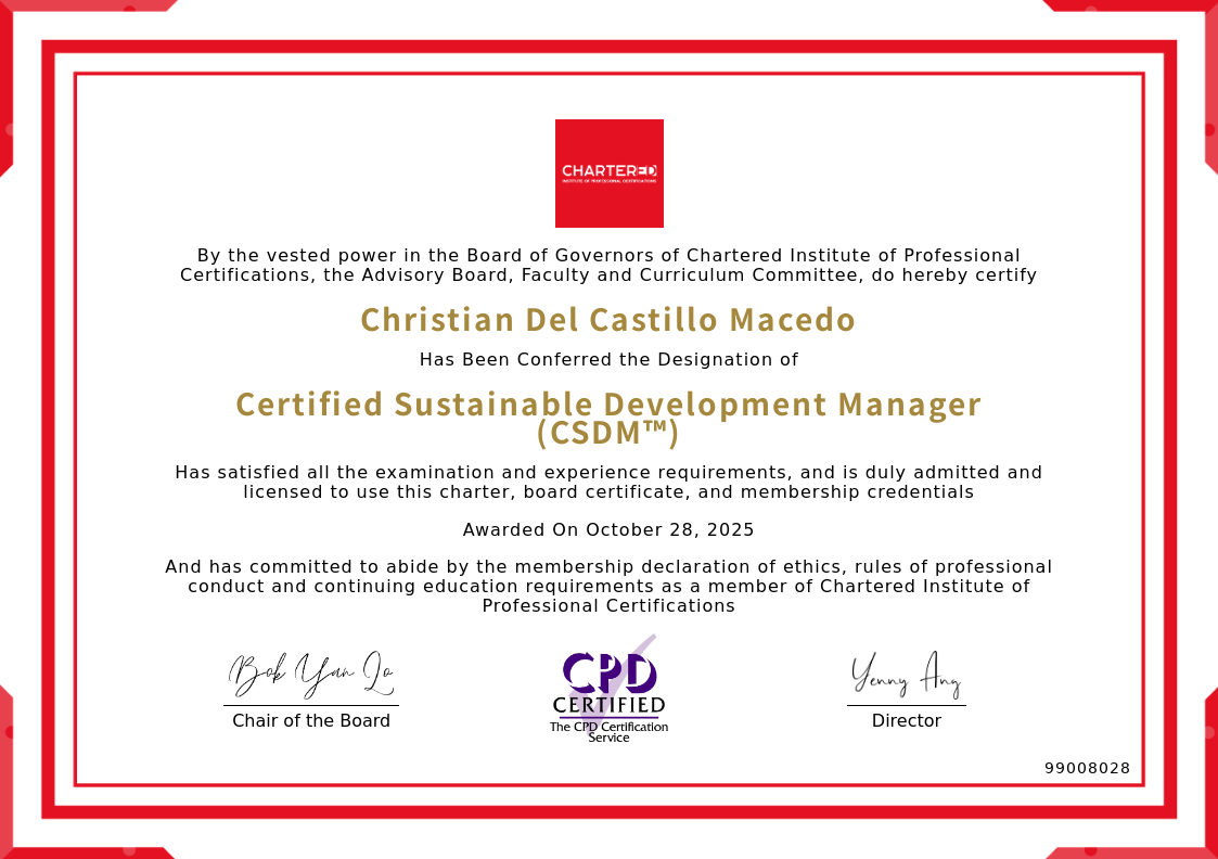 The certificate above verifies that Christian Del Castillo Macedo successfully satisfied all the exam and experience requirements and is duly admitted and licensed to use this Charter Certified Sustainable Development Manager (CSDM™), board certificate.