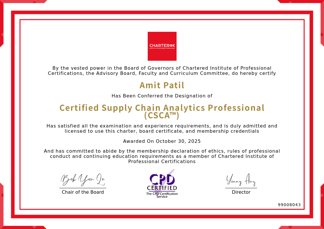 The certificate above verifies that Amit Patil successfully satisfied all the exam and experience requirements and is duly admitted and licensed to use this Charter Certified Supply Chain Analytics Professional (CSCA™), board certificate.